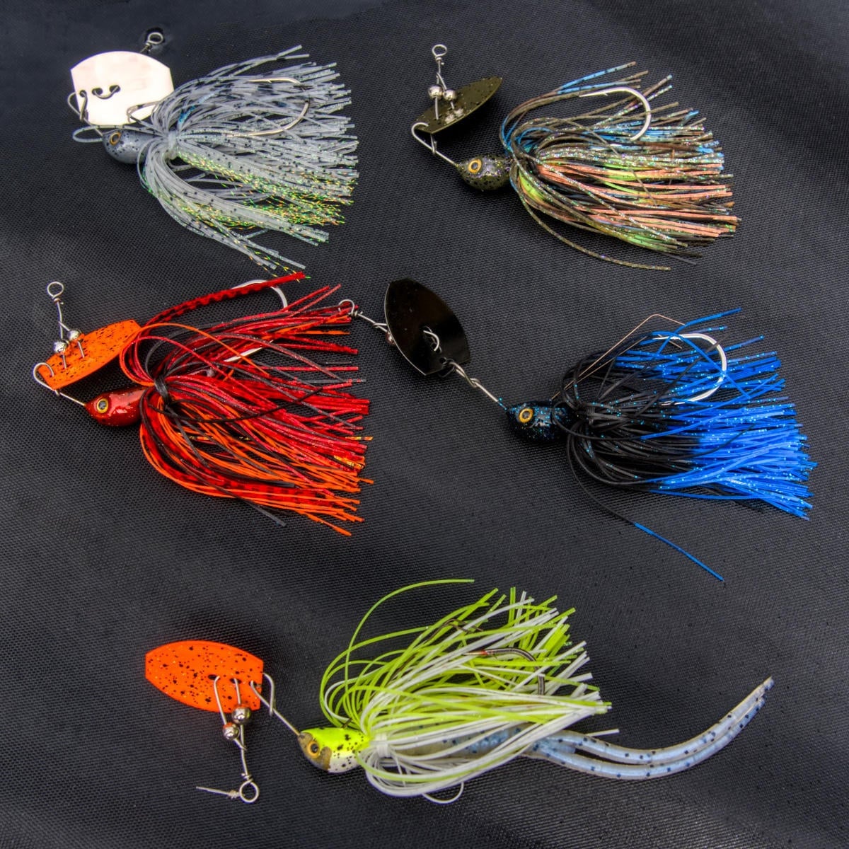 The Racket Blade comes in 16 different skirt colors and most of those have multiple blade color options. They have gold, silver, black, orange, green, and red blade options on a lot of the baits. But you can mimic spring craws, bluegills, nighttime and dark water colors and more shad and forage patterns.
