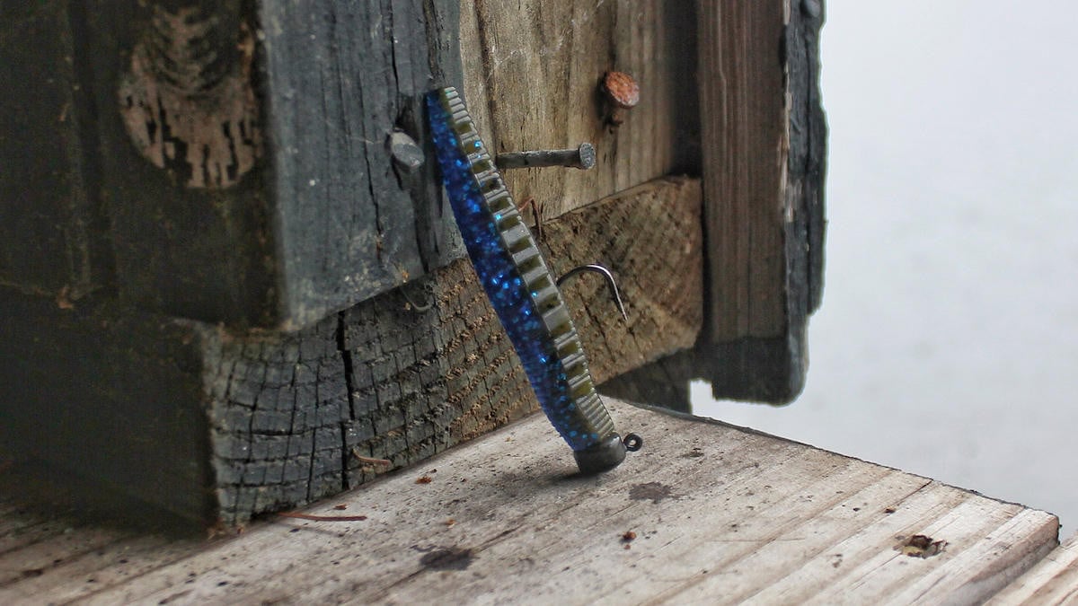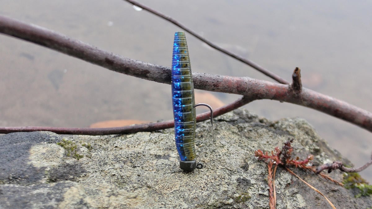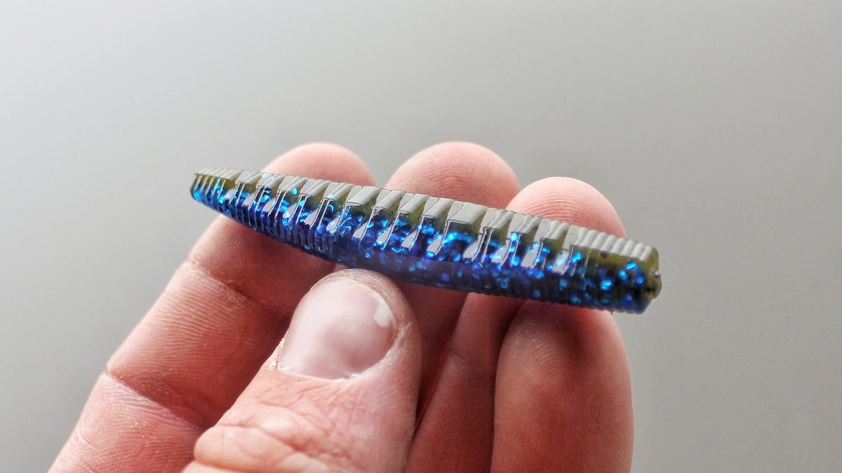 One of the first differences I noticed was that the Ned Ocho has more of an oval cross section than a round one, meaning the bait is a little taller than it is wide. Most other Ned baits are more rounded, but this iinteresting characteristic gives the bait a slightly different profile. Another unique trait of the bait is the set of ribs or channels running down each side. These were designed to trap air bubbles, which is cool. But I found something else they really make this bait work well for.