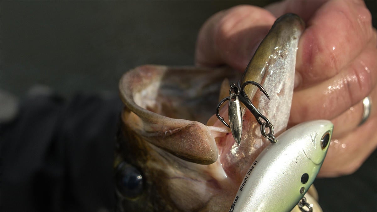 I’ve been putting the VMC Bladed Hybrid Treble Hook on the front of my lures most of the time to help the bass eat the entire lure a little better, resulting in a better hookup ratio. Doing this, however, could result in a bunch of tangling with the back hook or split ring if it were a larger-framed treble hook.
