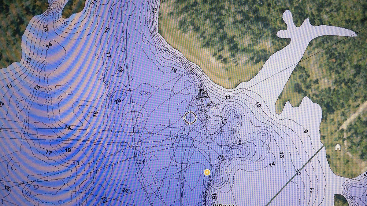 Bolton is an old school map guy. But he used the very detailed maps on the Lakemaster chip to figure out exactly where drains came out of pockets and bays and intersected points where he thought he could find grass edges in the right depth zone.