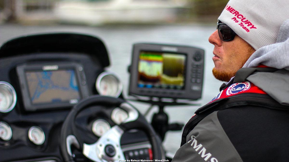 Bertrand studies the contour map on his graph and idles in a zig zag pattern over various areas to search for active fish and structure. Active fish will look like snakes or spaghetti noodles on your graph.